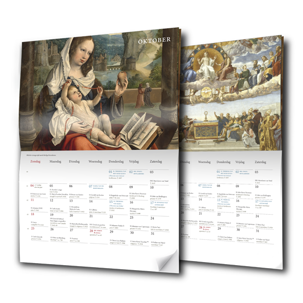 Heiligenkalender 2025 met liturgische feestdagen. Een bijzondere katholieke heiligenkalender met de heilige van de dag en twaalf prachtige kunstplaten. De kalender toont kunstwerken van grootmeesters als o.a. Rafaël, Murillo, Rembrandt en Giotto. Geselecteerd op twaalf thema’s die de kerkelijke traditie volgen. De kalender beslaat twee pagina’s per maand (twee maal een A4), de bovenste helft toont het kunstwerk van de maand; de onderste helft geeft de werkelijke kalender weer met de heilige van de dag, de liturgische feest- of gedenkdag en de week door het jaar.